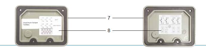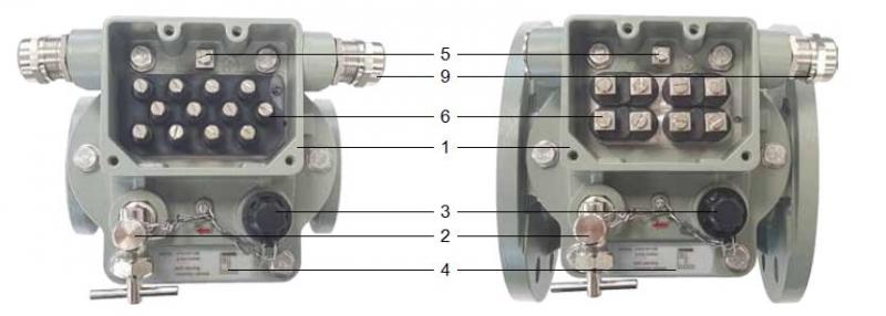 頂蓋是由耐氣候變化的鑄鋁合金制成,表層已涂色. 頂蓋部件上部有一個接線盒(圖4中1),在接線盒前面有一個放氣閥(圖4中2)和一個用悶蓋螺母(圖4中3)覆蓋的測試按鈕,同時上面還附有一個測試按鈕操作說明標牌(圖4中4). 接線盒中除了有一個接地點(圖4中5)外,頂蓋底板內(nèi)還裝有電力引線端子(圖4中6). 通過電力引線端子的數(shù)量可以決定涉及干簧管類型與數(shù)量的開關(guān)系統(tǒng)的布線配置.